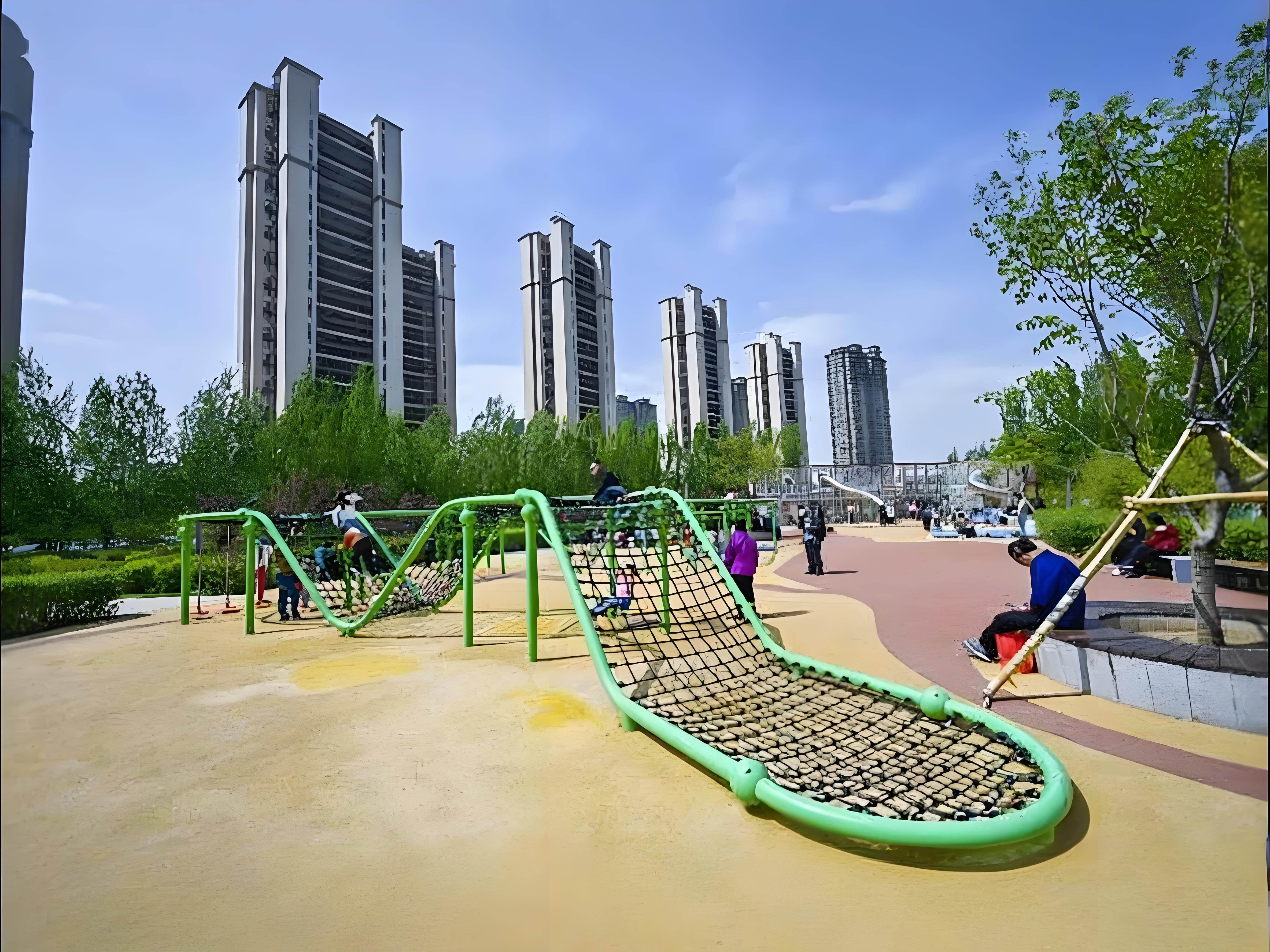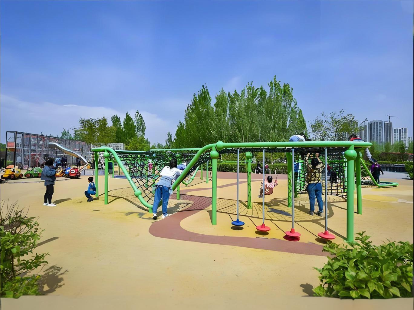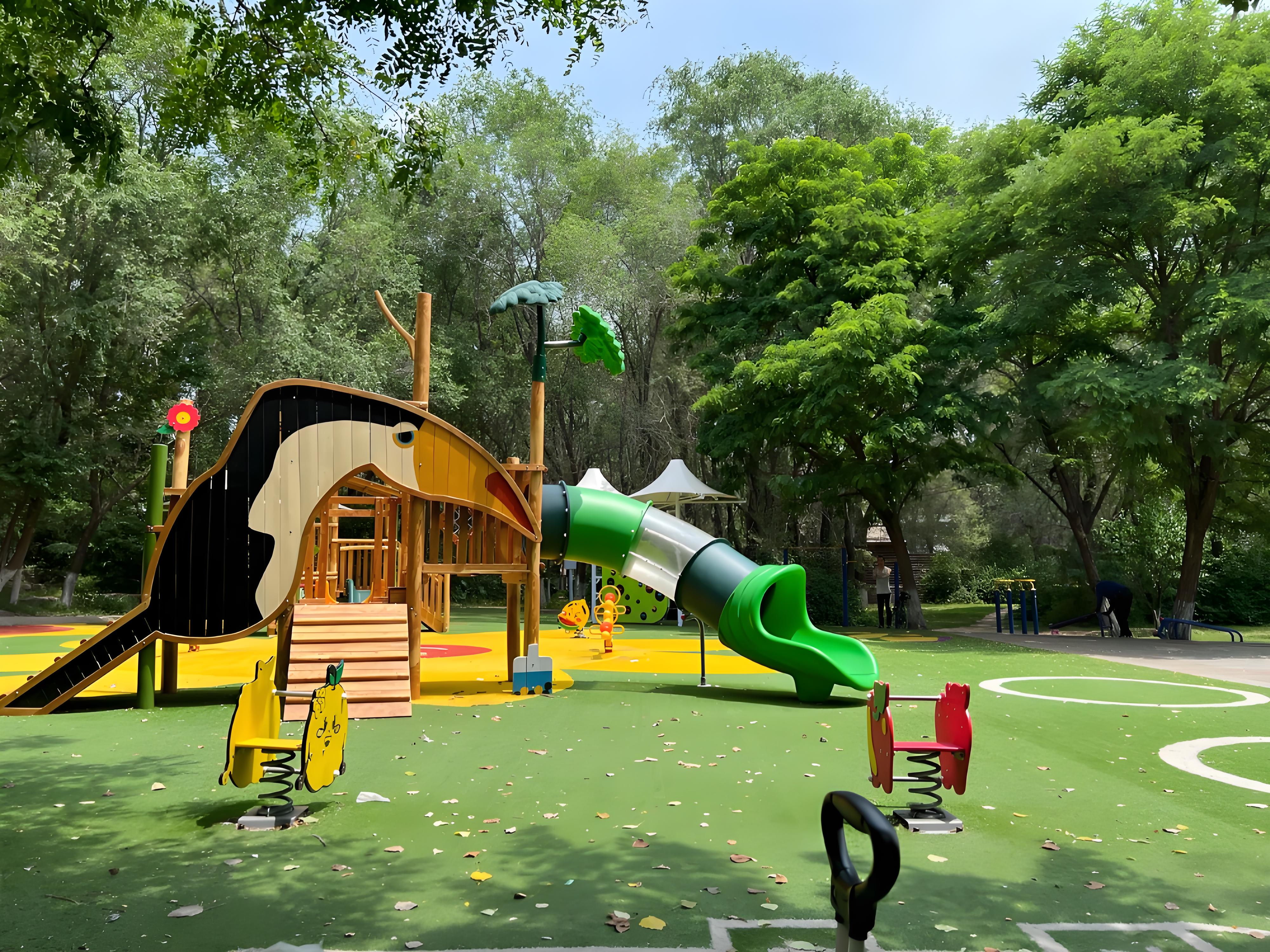 游乐设施采用圆角防撞设计,地面铺设缓冲材质(如沙池、EPDM),攀爬区设置防坠网;