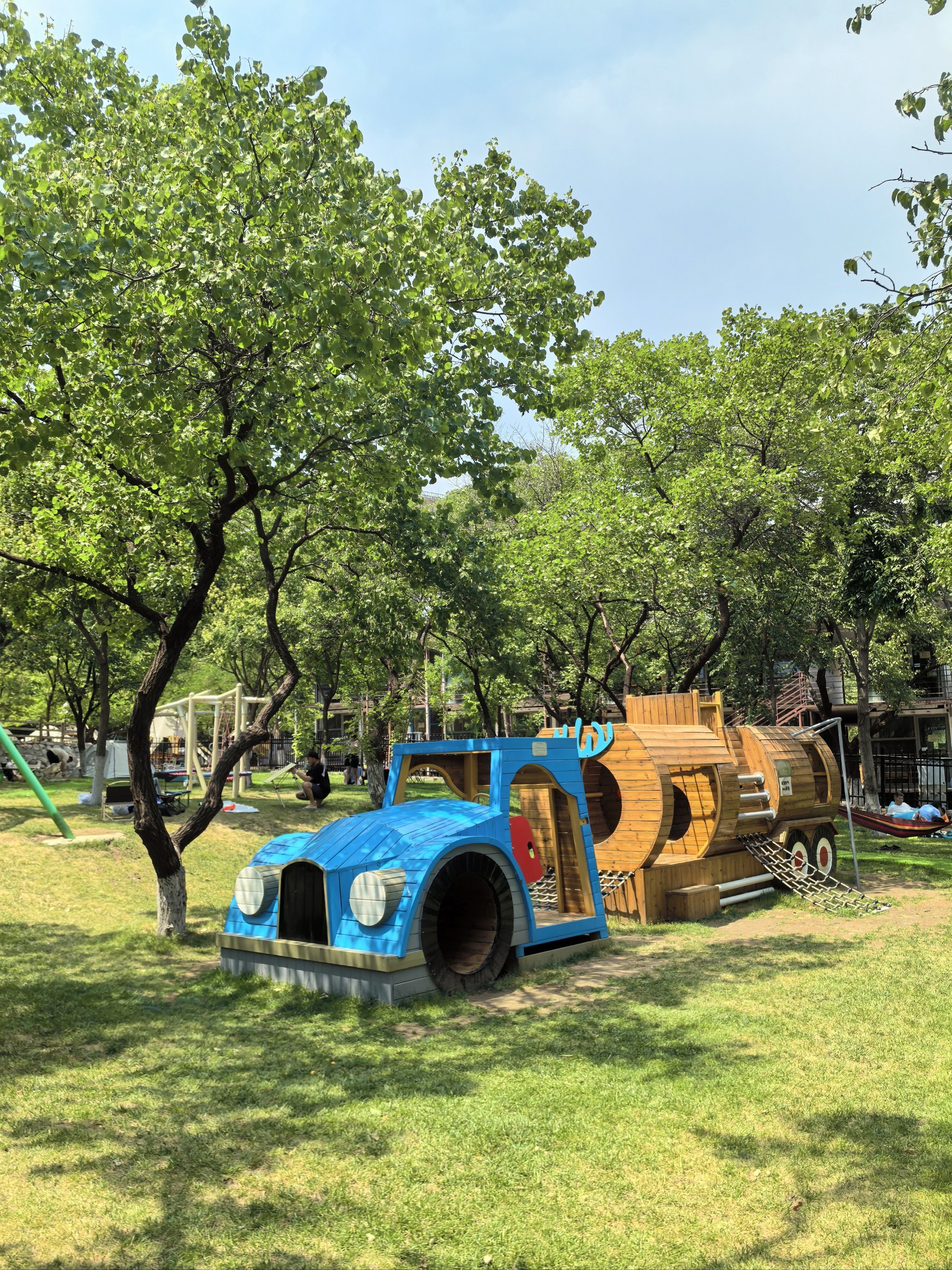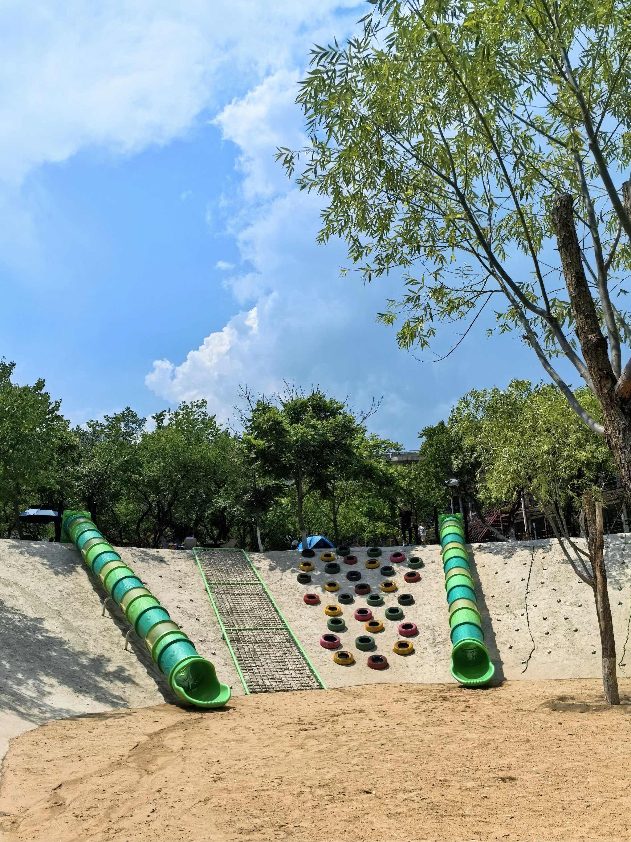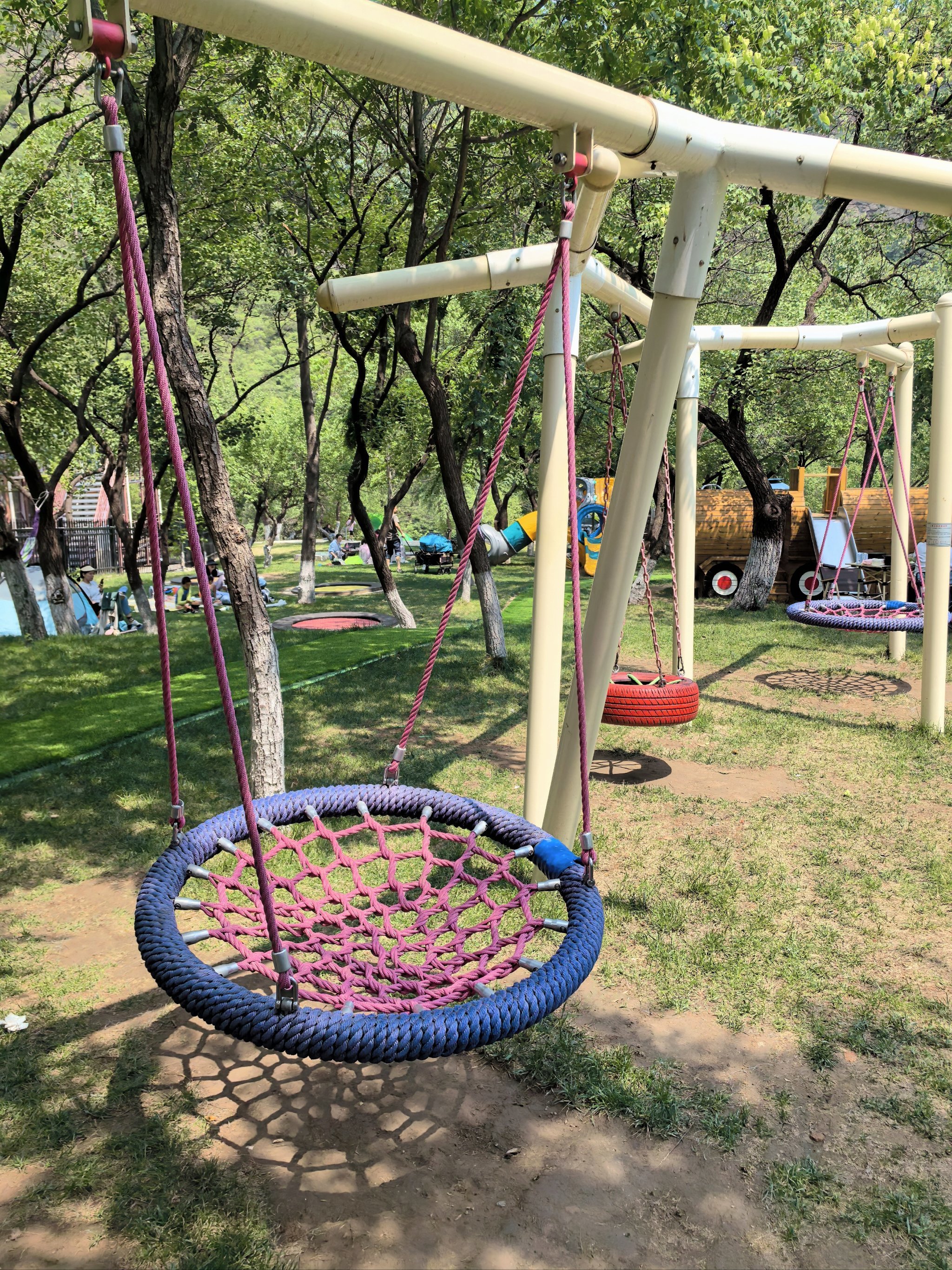 蹦床与秋千:分散布局于树荫下,兼顾安全性与趣味性。