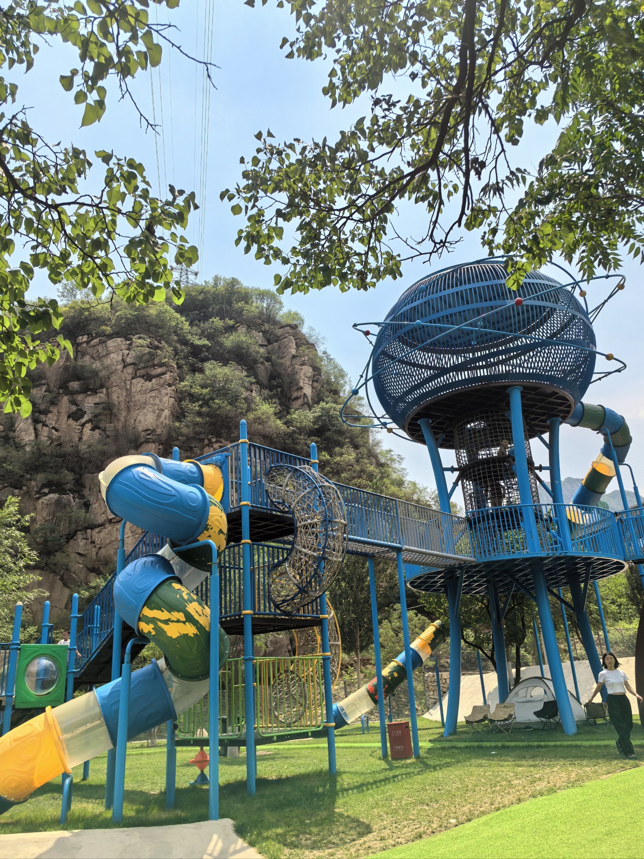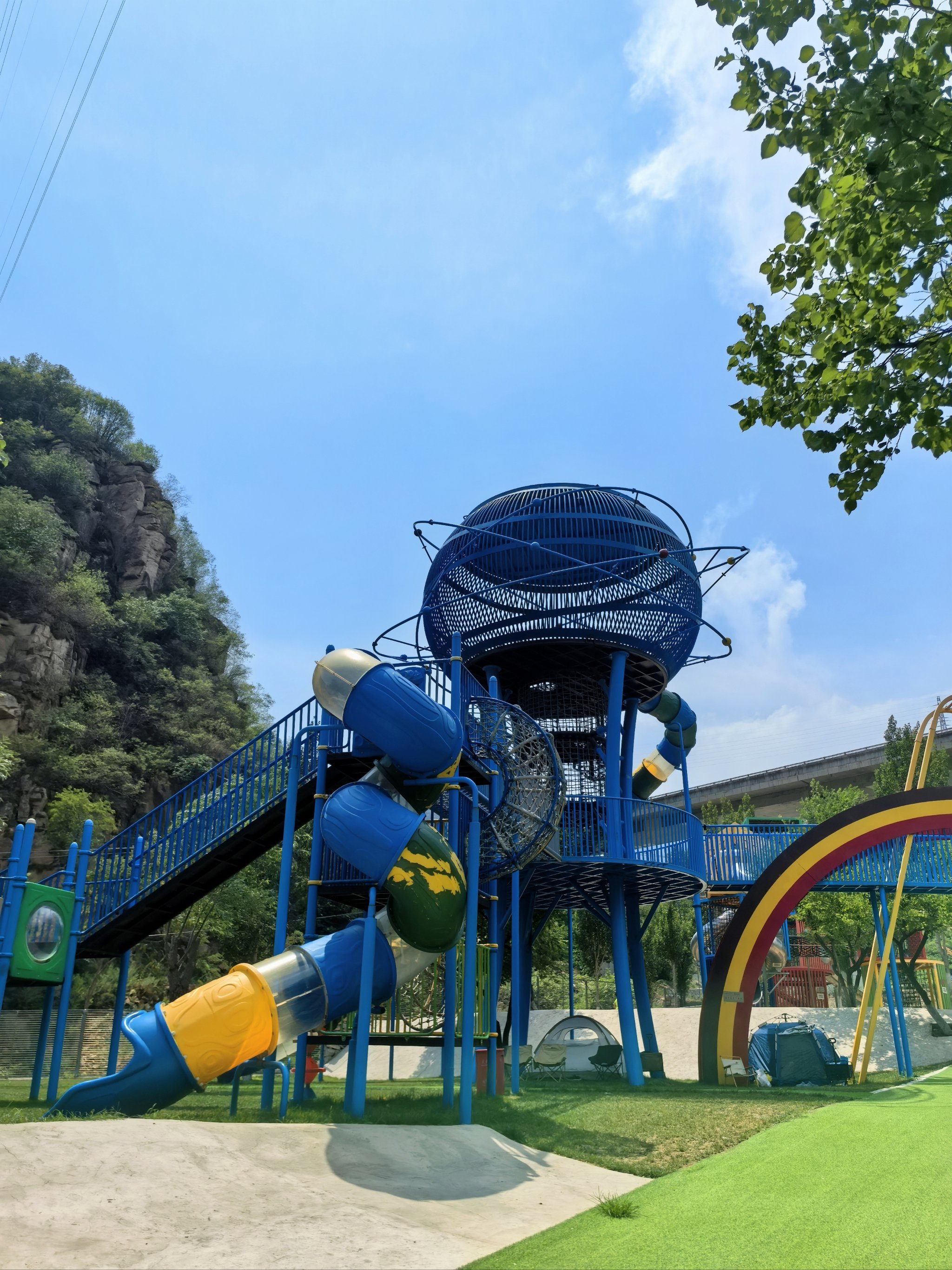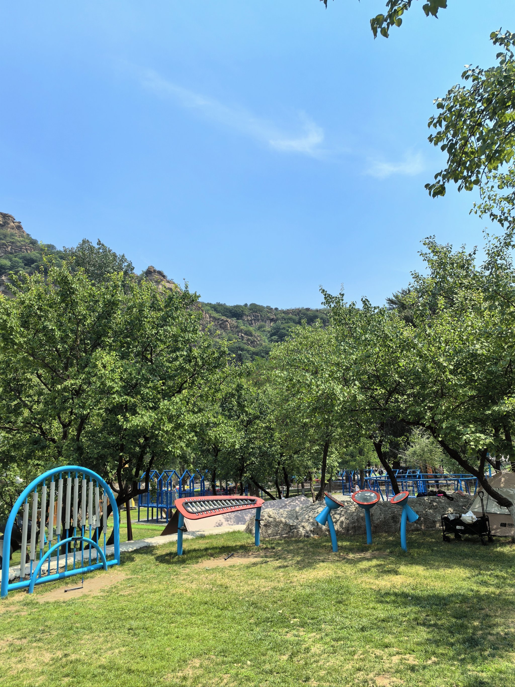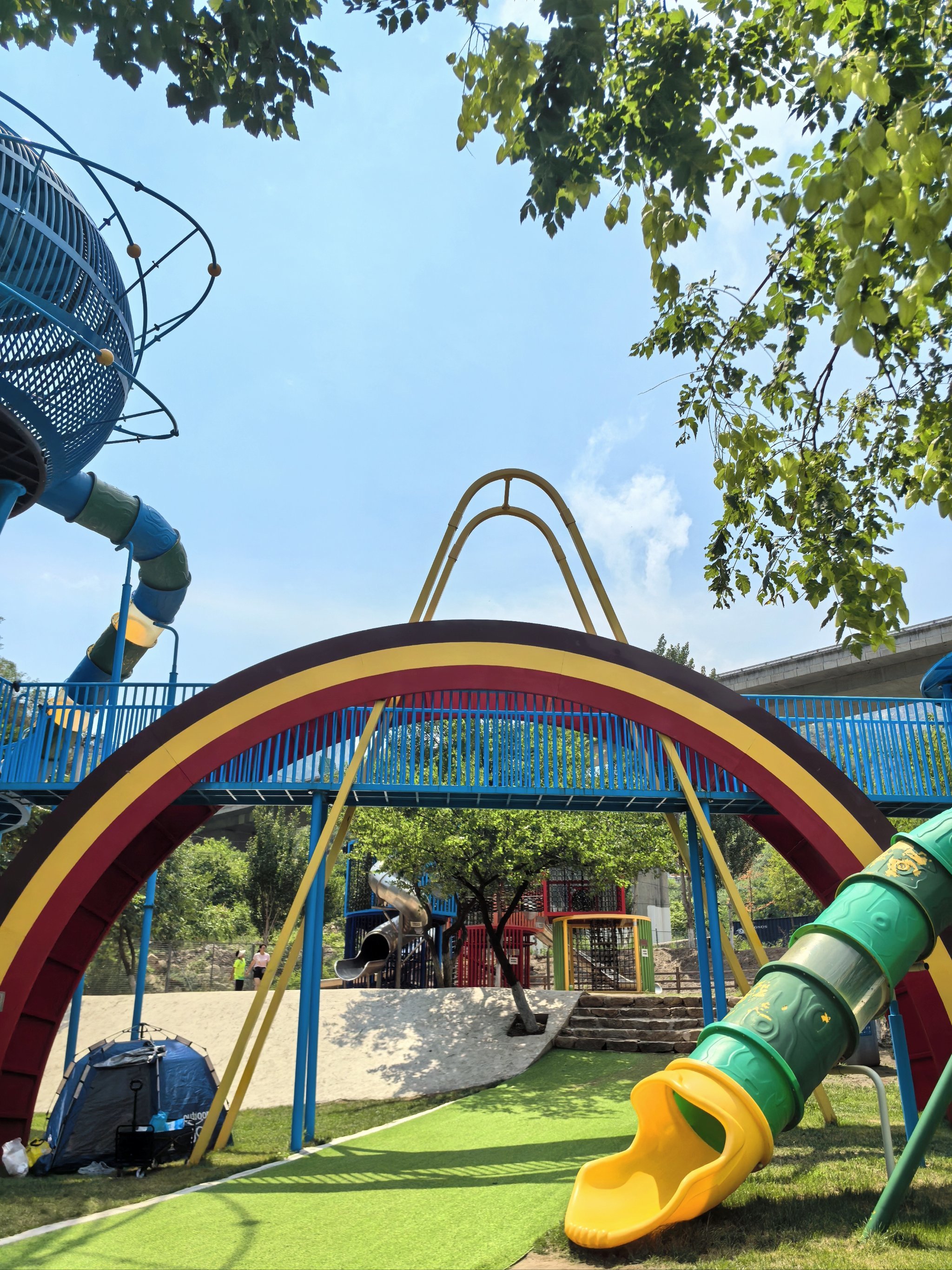 蹦床与秋千:分散布局于树荫下,兼顾安全性与趣味性。